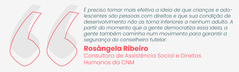 Em caso de ameaça ou agressão de qualquer tipo, o conselheiro ou conselheira deve acionar os órgãos competentes de segurança pública. “Além disso, é importante que haja um trabalho de base em toda e qualquer comunidade para democratizar a atuação do conselheiro tutelar, para que ele possa se sentir seguro na região. É preciso tornar mais efetiva a ideia de que crianças e adolescentes são pessoas com direitos e que sua condição de desenvolvimento não as torna inferiores a nenhum adulto. A partir do momento que a gente democratiza essa ideia, fazendo-a circular em todos os lugares, a gente também caminha num movimento para garantir a segurança do conselheiro tutelar”, finaliza Rosângela.