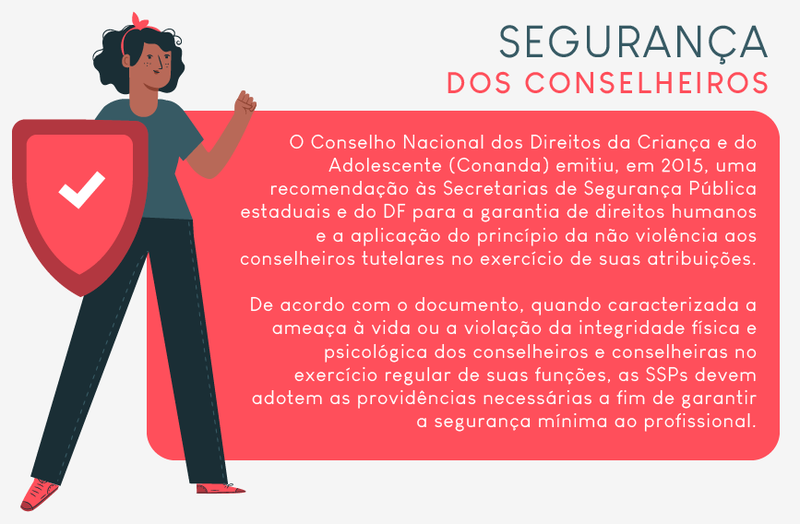 “A alternativa é trabalhar na perspectiva das parcerias, para que seja garantida a segurança do conselho tutelar no seu fazer profissional”, acrescenta. O Conselho Nacional dos Direitos da Criança e do Adolescente (Conanda) emitiu, em 2015, uma recomendação às Secretarias de Segurança Pública estaduais e do DF para que garantam a aplicação da não violência aos conselheiros tutelares no exercício das atribuições.