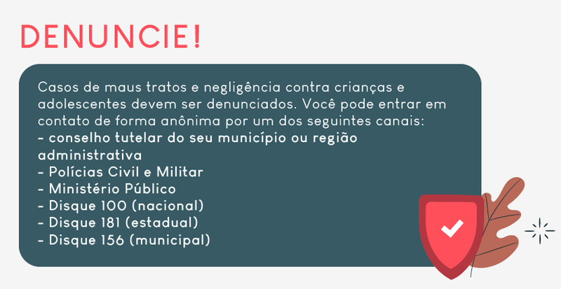 Em caso de abuso e negligência contra crianças e adolescentes, denuncie. Entre em contato com o conselho tutelar da sua cidade, com as polícias Militar e Civil, Ministério Público e pelos telefones Disque 100, Disque 181 ou Disque 156.