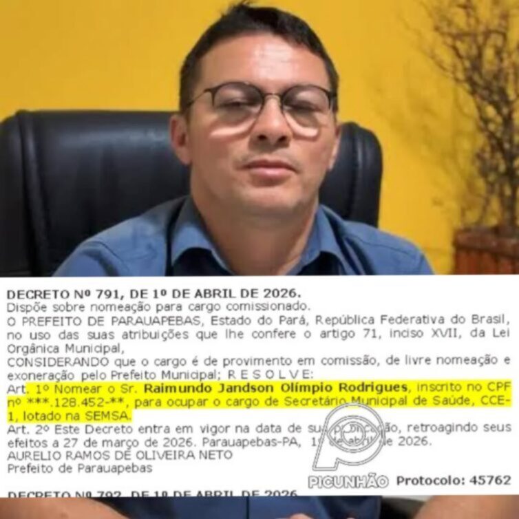 A caneta do Prefeito escolheu o Adjunto. Mal Veloso pediu pra sair, já entrou Raimundo Jandson Olímpio Rodrigues como novo secretário de Saúde de Parauapebas. No papel, é só mais uma nomeação. Na prática, é a troca de quem segura o pavio de uma das maiores bombas da gestão.